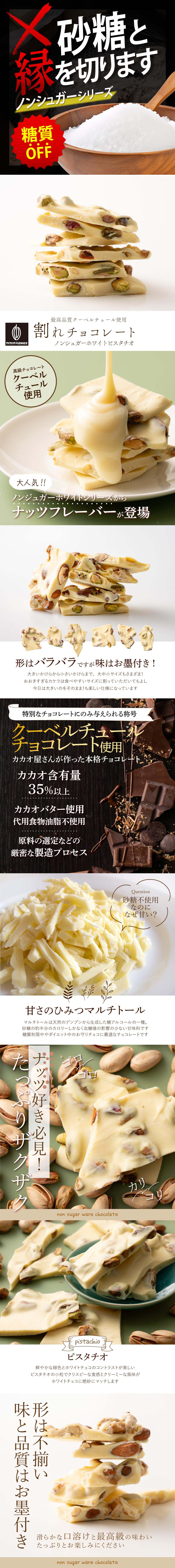 ・原材料/材質/素材:ノンシュガーホワイトチョコレート(マルチトール、全乳粉、ココアバター)(国内製造)、ピスタチオ/乳化剤、香料