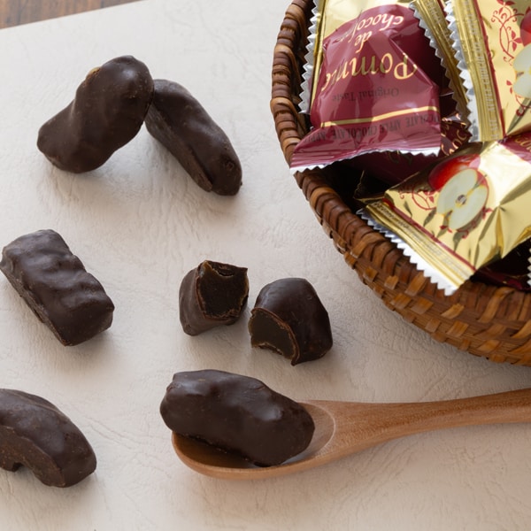 蜜づけしたりんごに、ダークチョコレートをコーティング。甘酸っぱい蜜づけりんごとダークチョコレートのほろ苦さのバランスが絶妙です。