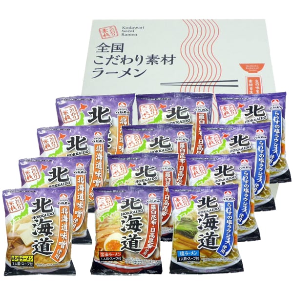 - 北海道醤油ラーメン(麺80g・スープ39g)・北海道味噌ラーメン(麺80g・スープ50g)・北海道塩ラーメン(麺80g・スープ42g)×各4袋