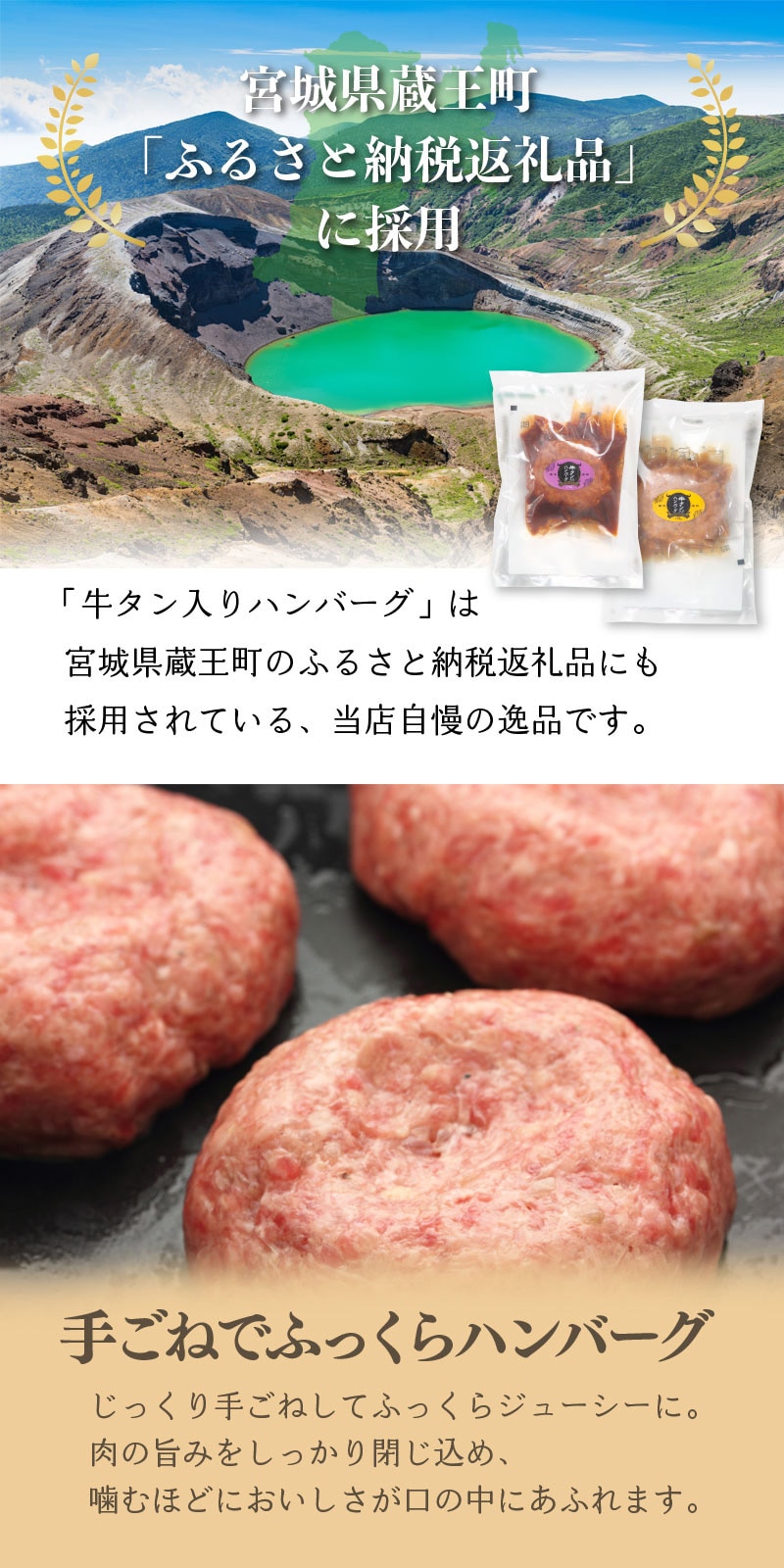 宮城県の名物「牛タン」と、旨み抜群の国産豚肉を絶妙なバランスで組み合わせた、当店自慢の牛タン入りハンバーグです。蔵王町のふるさと納税返礼品にも選ばれた、確かな品質とおいしさを誇る逸品。