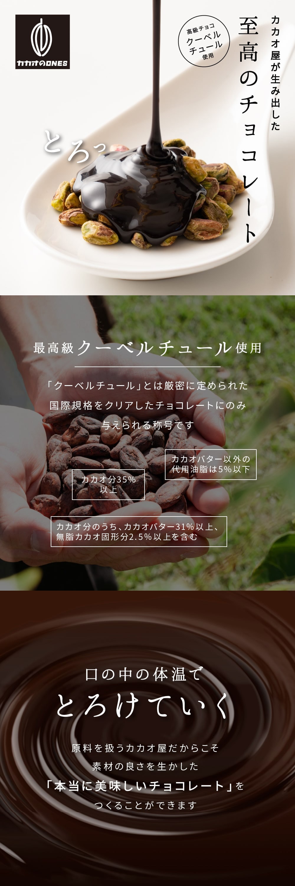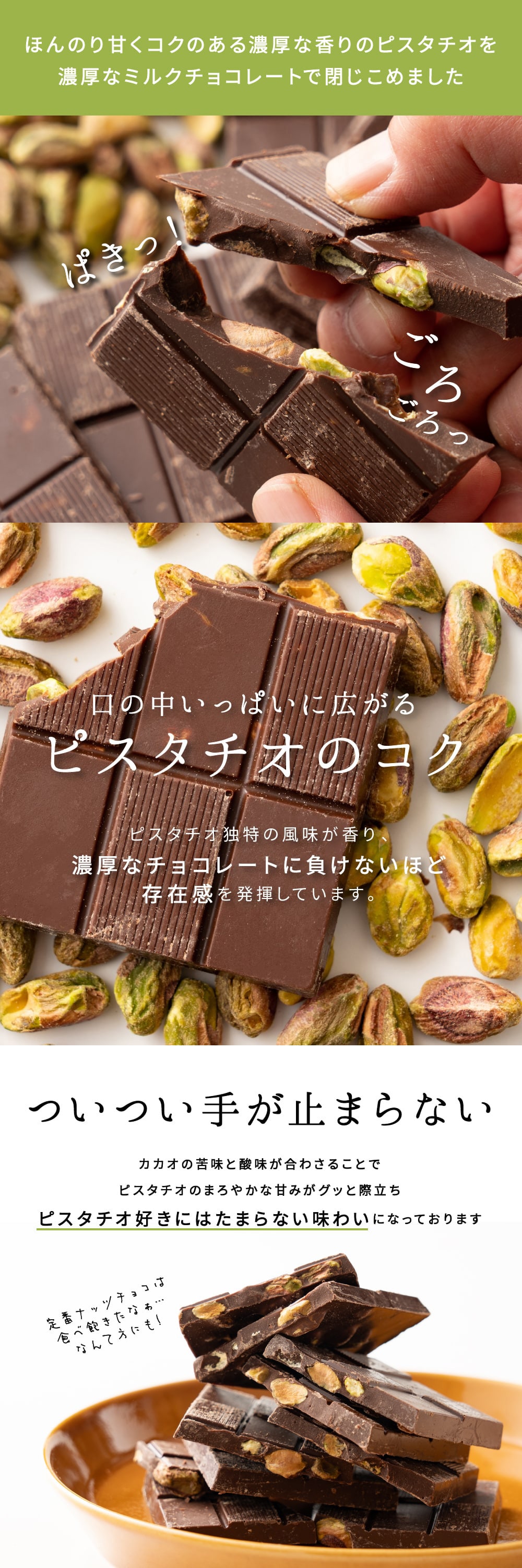 ・原材料/材質/素材:砂糖(タイ製造)、カカオマス、ココアバター、ピスタチオ、全粉乳/乳化剤、香料、(一部に乳成分・大豆を含む)