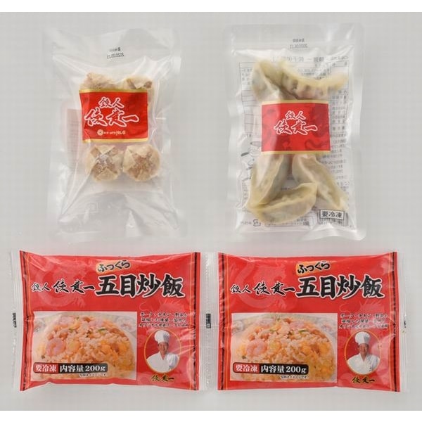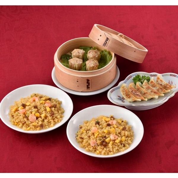 - 餃子120g(6個入)×1,貝柱入焼売120g(4個入)×1,ふっくら五目炒飯(200g×2)×1