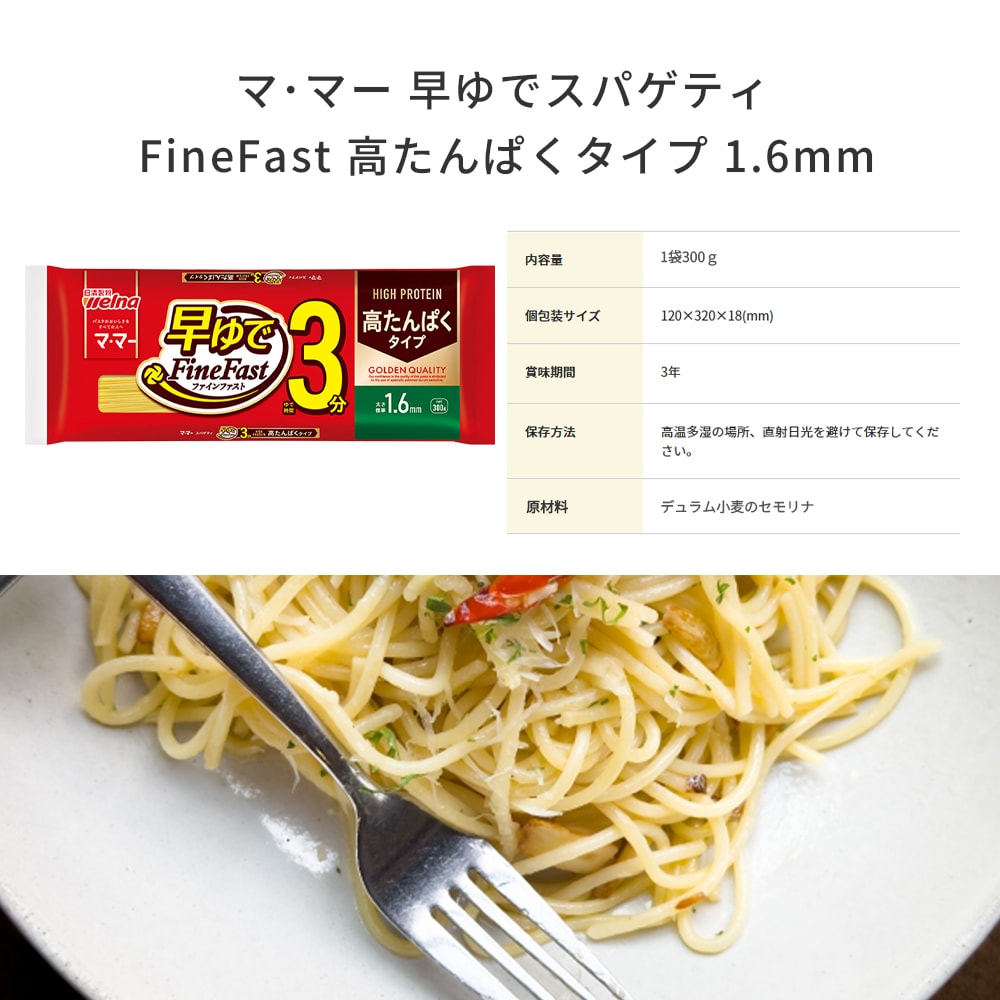 日清ウェルナの「マ・マ― 高たんぱく スパゲティ 早ゆで3分 1.6mm」は、栄養とおいしさを両立した新しいスパゲティです。
