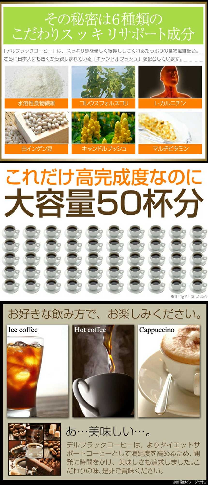 ・原材料/材質/素材: 水溶性食物繊維、インスタントコーヒー粉末、コレウスフォルスコリエキス末(コレウスフォルスコリ抽出物、デキストリン)、コエンザイムQ10、Lーカルニチンフマル酸塩、白いんげん豆エキス、キャンドルブッシュエキス、ビタミンC、ナイアシン、ビタミンE、パントテン酸Ca、ビタミンB1、ビタミンB2、ビタミンB6、ビタミンA、葉酸、ビタミンD、ビタミンB12、香料