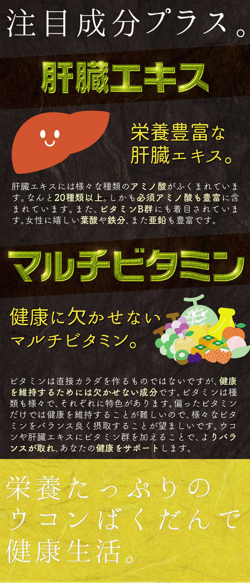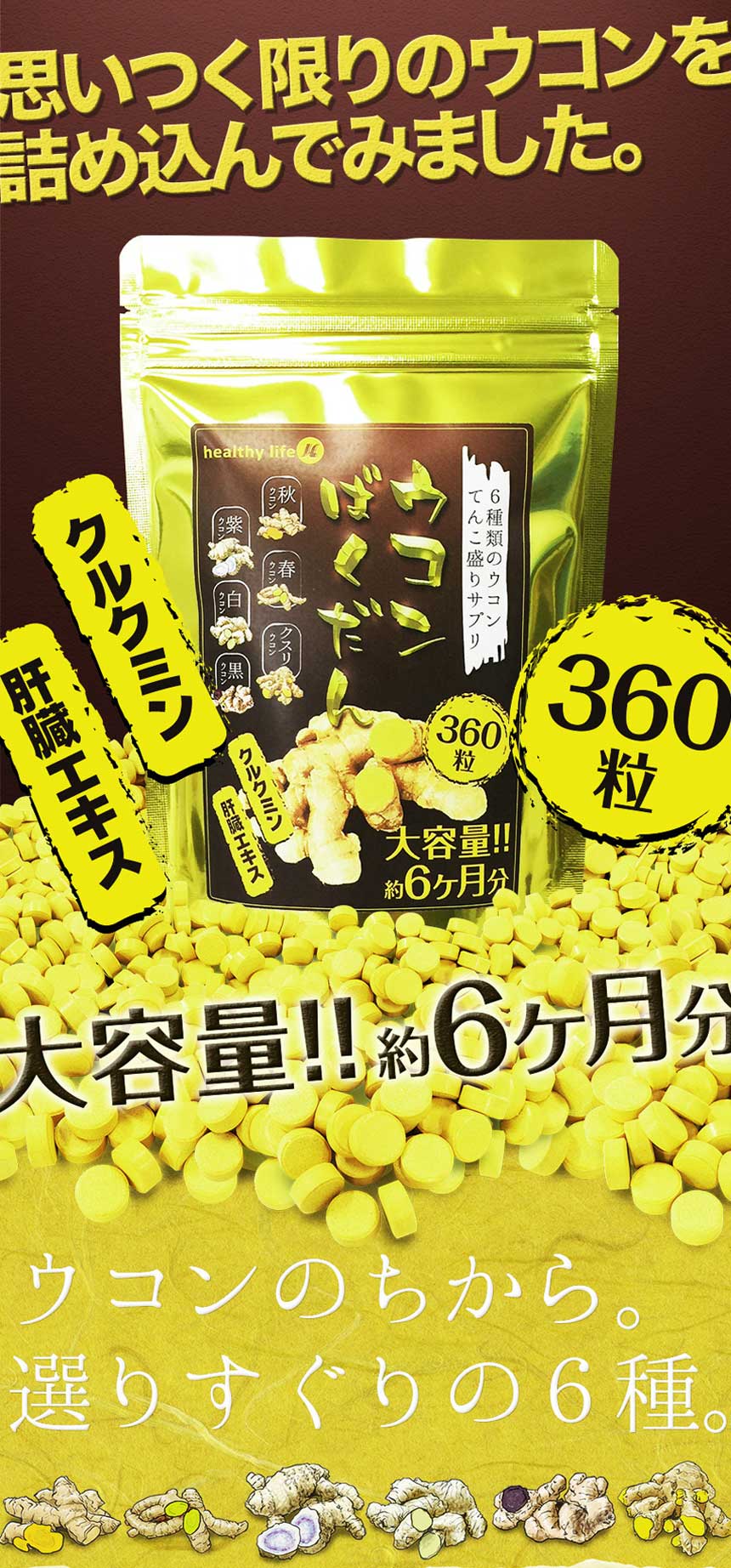 - 6種のウコン+クルクミン+肝臓エキス凝縮させたサプリメント!ウコンばくだん大容量6か月分!