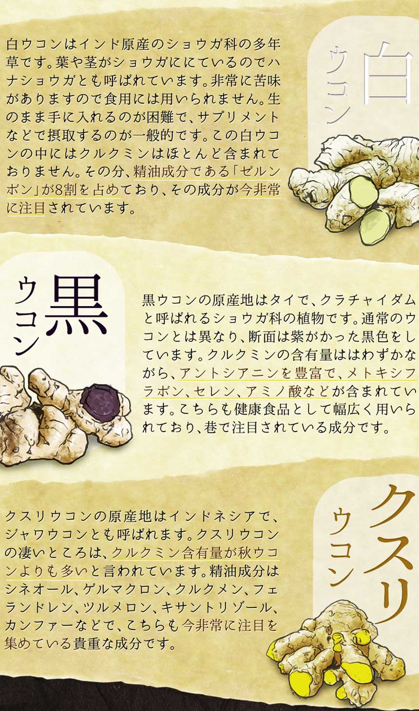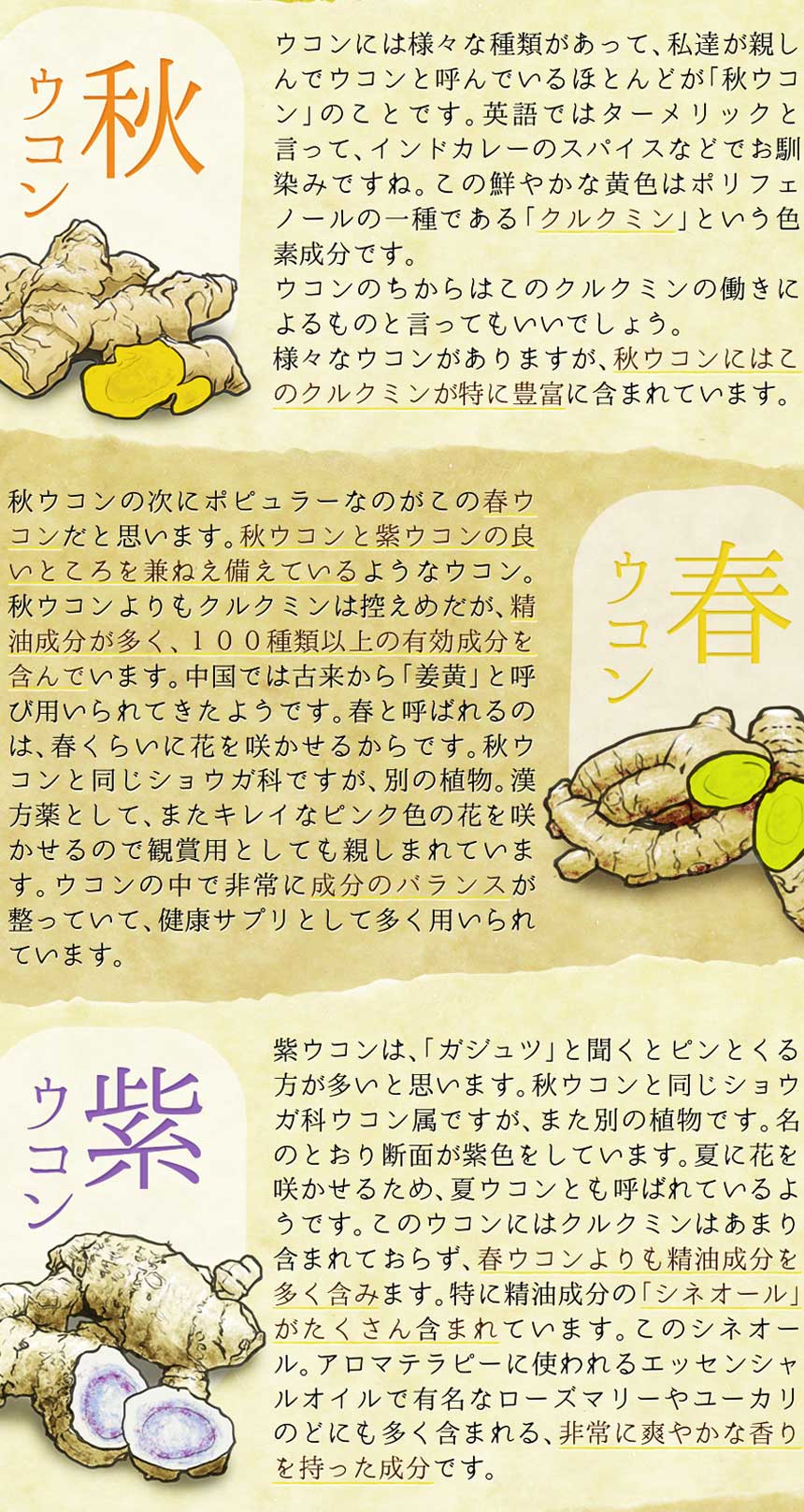 ・原材料/材質/素材:秋ウコン末、肝臓エキス末、ウコン抽出物(クルクミン含有)、黒ウコン末、紫ウコン末、春ウコン末、白ウコン末、クスリウコン末、セルロース、ショ糖脂肪酸エステル、微粒二酸化ケイ素、V.C、ナイアシン、パントテン酸Ca、V.E、V.B1、V.B2、V.B6、V.A、V.D、V.B12、葉酸