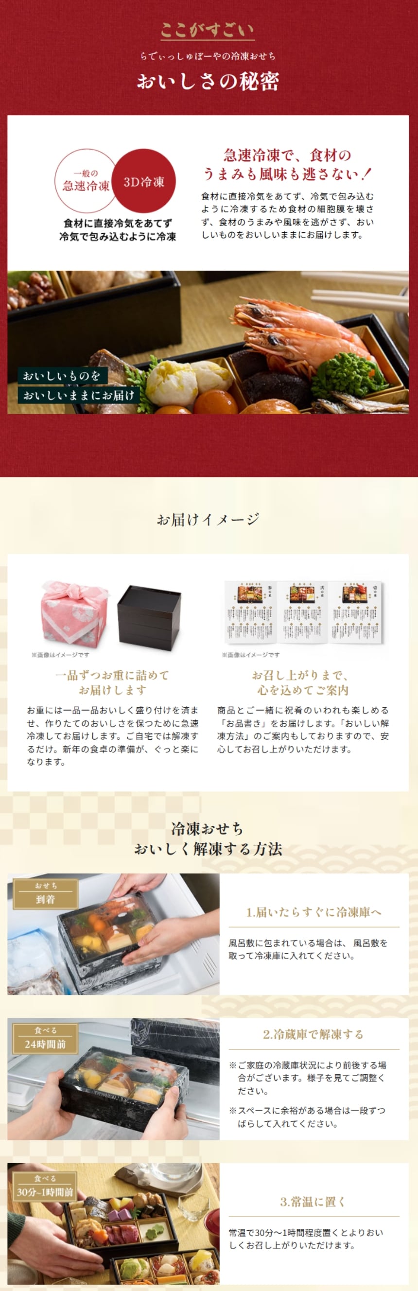 ・食べる直前の30分~1時間前に常温に戻しておくと更に美味しくお召し上がり頂けます。