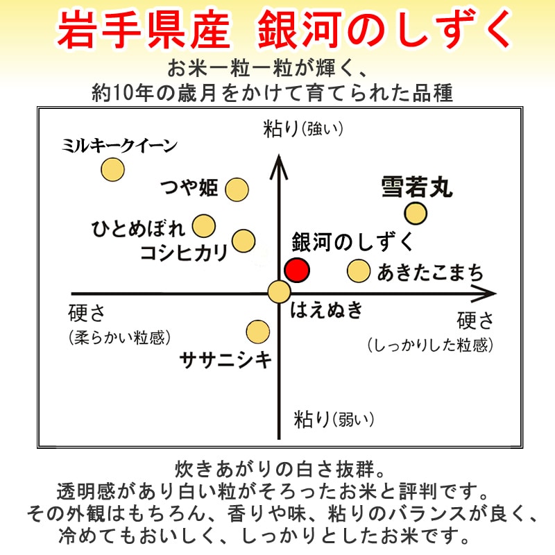 岩手県が約10年の歳月をかけて、作りだした新ブランド米「銀河のしずく」。お米一粒一粒が白くてつややか。そして、かろやかな食感。岩手県の本気が感じられる、食卓の新しい主役となるお米です。