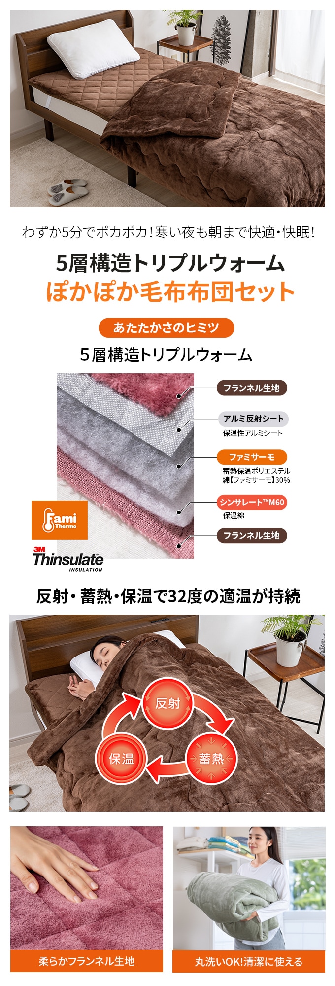 わずか5分でポカポカ!寒い夜も朝まで快適・快眠!「寝入りのヒヤッと感」や「夜中の冷え」にお悩みの方へ。柔らかなフランネル生地の心地よさはそのままに、冷たい外気を遮断し、体の熱を逃がさない機能に徹底的にこだわった5層構造の毛布布団セットです。このセットの秘密は、「蓄熱・保温・反射」のトリプルウォーム効果を狙った5層構造。体温を反射するアルミシート、断熱保温わたファミーサーモ、さらに敷パッドには吸湿発熱わたも使用し、わずか5分でポカポカの暖かさを実感できます。冬の就寝時に暖房器具への依存を減らせるため、毎日の電気代節約に大きく貢献し、家計にやさしい節電対策になります。実質、電気代0円で一晩中ぽかぽかです。