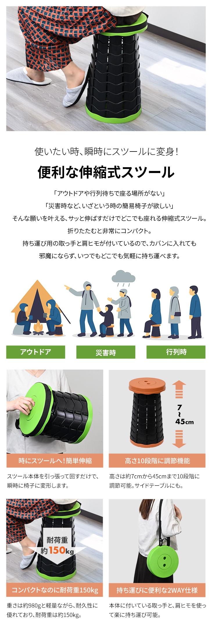 「アウトドアや行列待ちで座る場所がない」「災害時など、いざという時の簡易椅子が欲しい」そんな願いを叶える、サッと伸ばすだけでどこでも座れる伸縮式スツールです。折りたたむと非常にコンパクト。持ち運び用の取っ手と肩ヒモが付いているので、カバンに入れても邪魔にならず、いつでもどこでも気軽に持ち運べます。