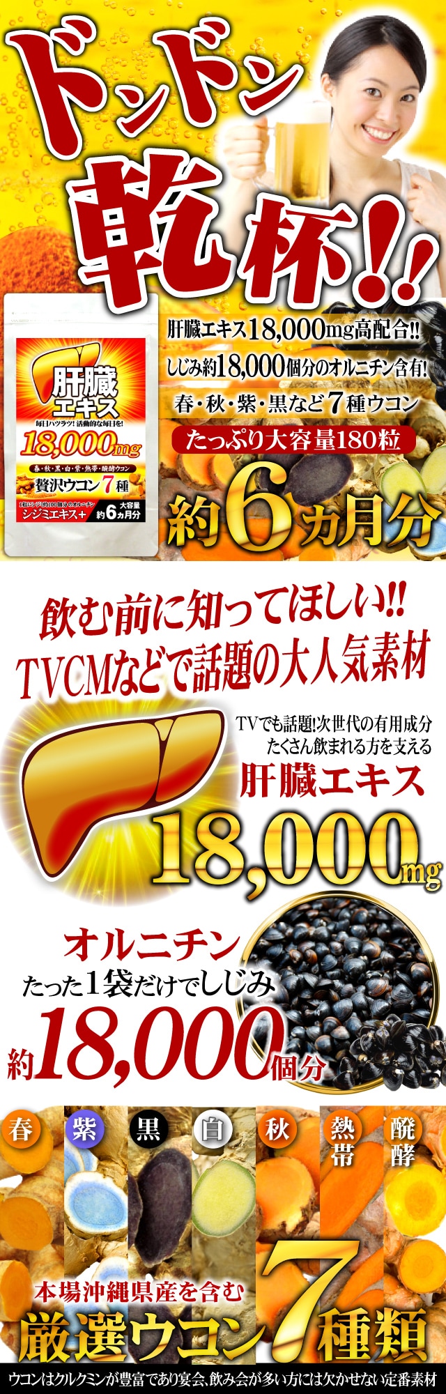 ・原材料/材質/素材:豚肝臓エキス末(ドイツ製造)、L-オルニチン塩酸塩、秋ウコン末、しじみエキス、春ウコン末、紫ウコン末、黒ウコン末、醗酵ウコン末、白ウコン末、熱帯ウコン末/結晶セルロース、ステアリン酸カルシウム(一部に豚肉を含む)