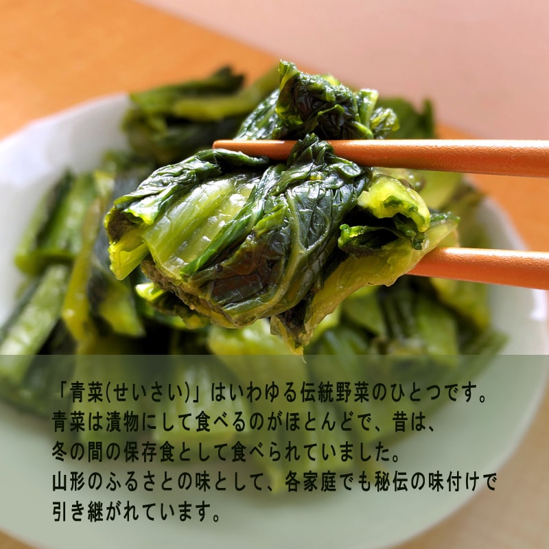 ・原材料/材質/素材:青菜(山形県産)、醤油、ざらめ、塩、唐辛子、 焼酎、醸造酒(一部に小麦・大豆を含む)