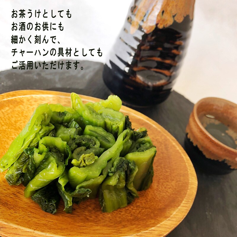 ・お召し上がり方:ほど良い歯応えのある茎の部分は、3cm程に切って食べていただくのがおすすめです。細かく刻んで、ホカホカのご飯にのせたり、納豆にまぜて食べるのもおすすめです。