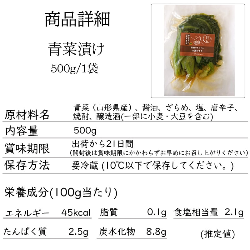 ・原材料/材質/素材:青菜(山形県産)、醤油、ざらめ、塩、唐辛子、 焼酎、醸造酒(一部に小麦・大豆を含む)