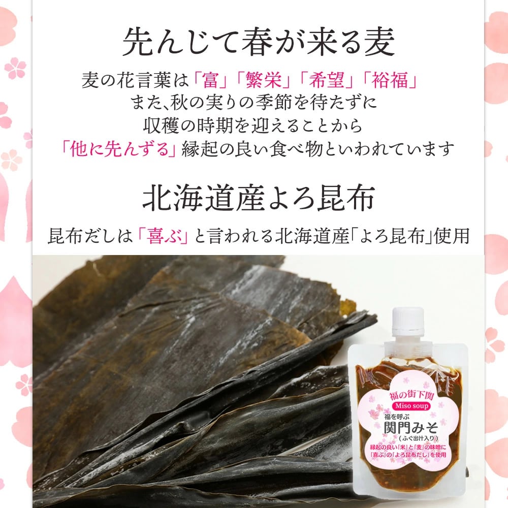 - ・関門みそ(150g×1袋)+オニオンスープ(3.8g×1袋)+中華スープ(4.2g×1袋)+わかめスープ(3.8g×1袋)+お吸い物(3.4g×1袋)