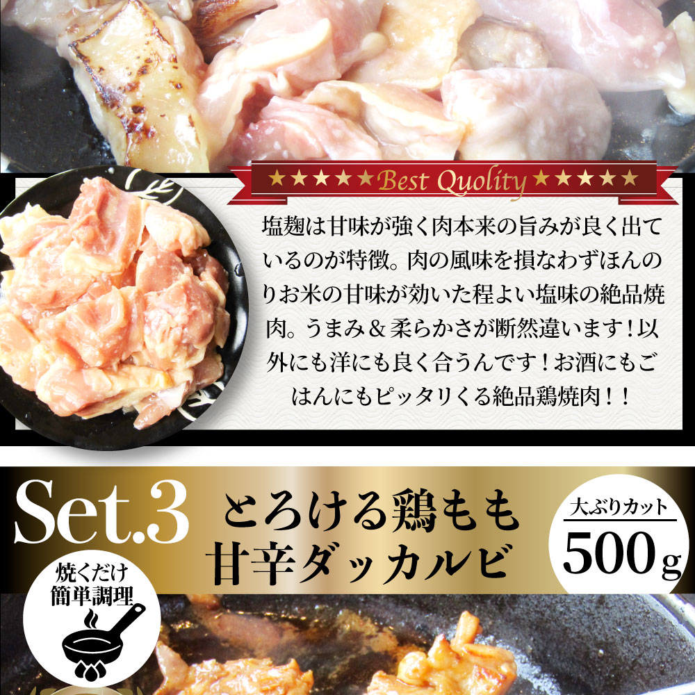 【1.5kg(500g×3)】ジューシー鶏もも焼肉 3種 食べ比べ福袋/焼くだけ簡単! | 秘伝の塩麹タレに漬け込んだ「ダッカルビ(旨辛味)」「鶏照り焼き」「塩麹漬け焼肉」