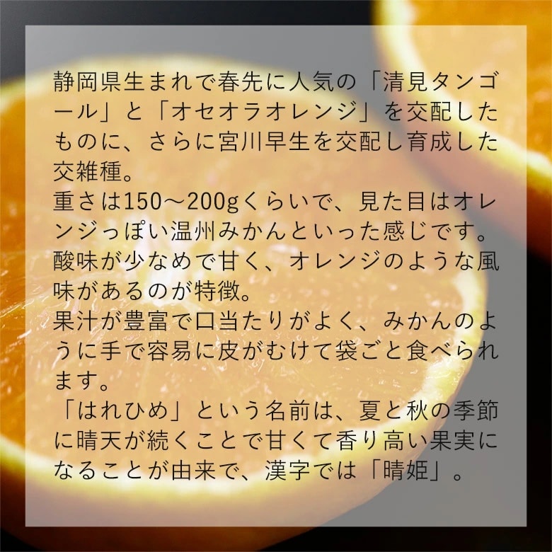 【予約受付】12/15~順次出荷【約5kg】はれひめ 優品 | 酸味が少なめで甘く、オレンジのような風味があるのが特徴。