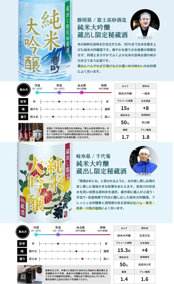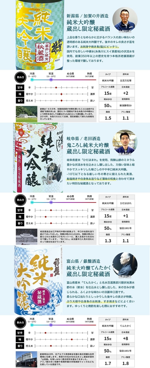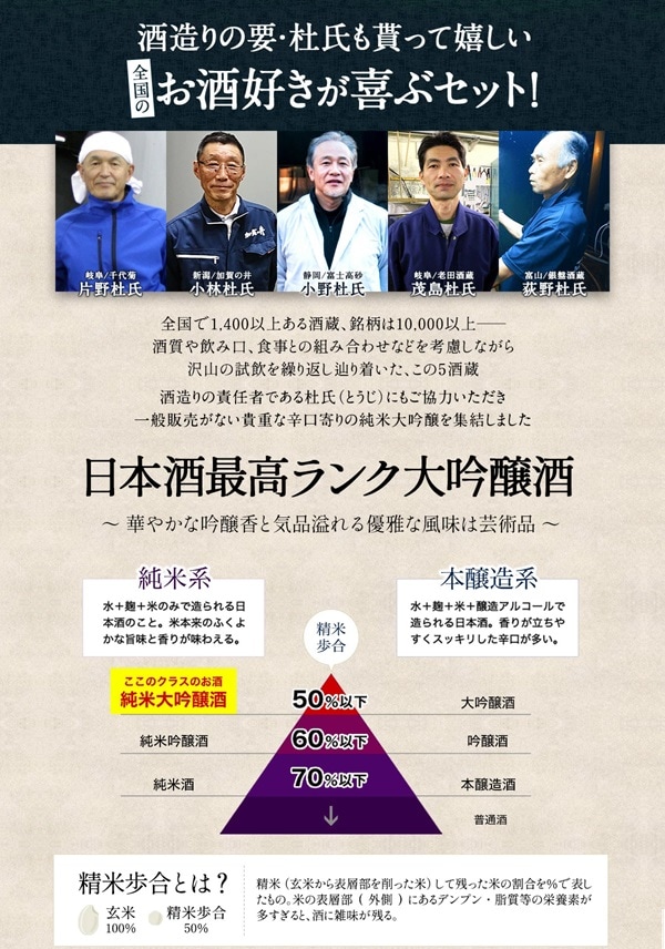 厳選した各蔵元と交渉を重ねに重ね、酒造りの責任者である杜氏(とうじ)にもご協力いただき、通常ではお目にかかることが出来ない貴重な蔵出し秘蔵酒の辛口寄りの純米大吟醸酒を集結させることが出来ました。