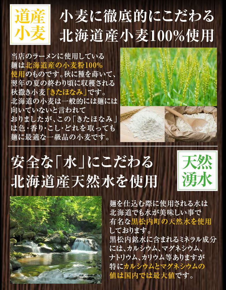 麺を仕込む際に使用される水は北海道でも水が美味しい事で有名な【黒松内町の天然水を使用】しております。カルシウムとマグネシウムの値は国内最大値です。