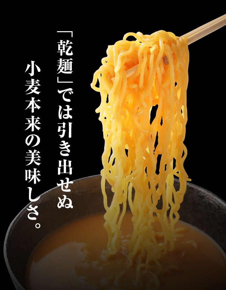 「北海熟成麺」は「麺帯2段熟成」という特別な熟成方法により、もちもちとした食感としっかりとしたコシが特徴です。北海道らしい「縮れ太麺」でスープとの相性は抜群です。「ラーメン屋で食べるより旨い!!」と非常に嬉しいお言葉を頂くほど原料・製法に徹底的にこだわった自慢の麺です。
