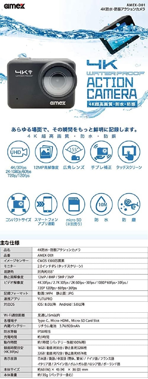 アクションカメラ 4K防水・防振 AMEX-D01 | 防水、手ブレ補正、4K対応で美しく鮮明な映像が撮影可能