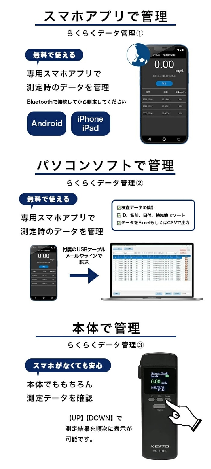 パソコンに取り込んだアルコール検知データを一括で集計して、ファイル管理できるパソコン用管理ツールの「KEIYO Alcohol Sensor Data Management Tool」を無料でお使いいただけます。