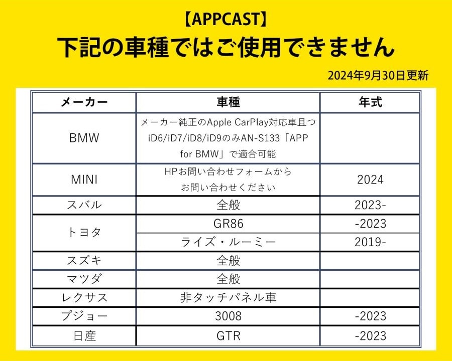※メーカー純正のディスプレイオーディオでApple CarPlay/Android Auto対応車のみ適合となります。(Android Autoのみ対応車種は未対応です。)