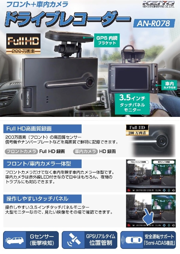 ドライブレコーダーフロント+車内カメラ付きfullHD GPS内蔵 3.5インチ AN-R078 | 前方も車内も録画できるドライブレコーダー