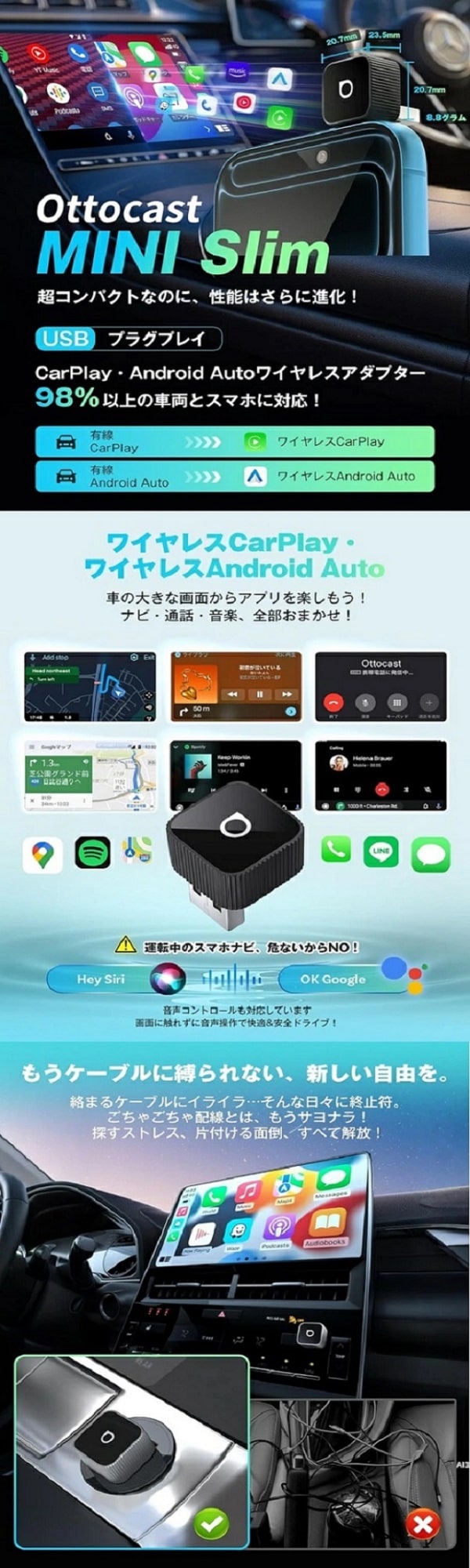 大人気のオットキャストから、最新ワイヤレスアダプター「Ottocast MINI Slim」が新登場。車のポートに差し込むだけで、CarPlayやAndroid Autoをワイヤレス化できます。