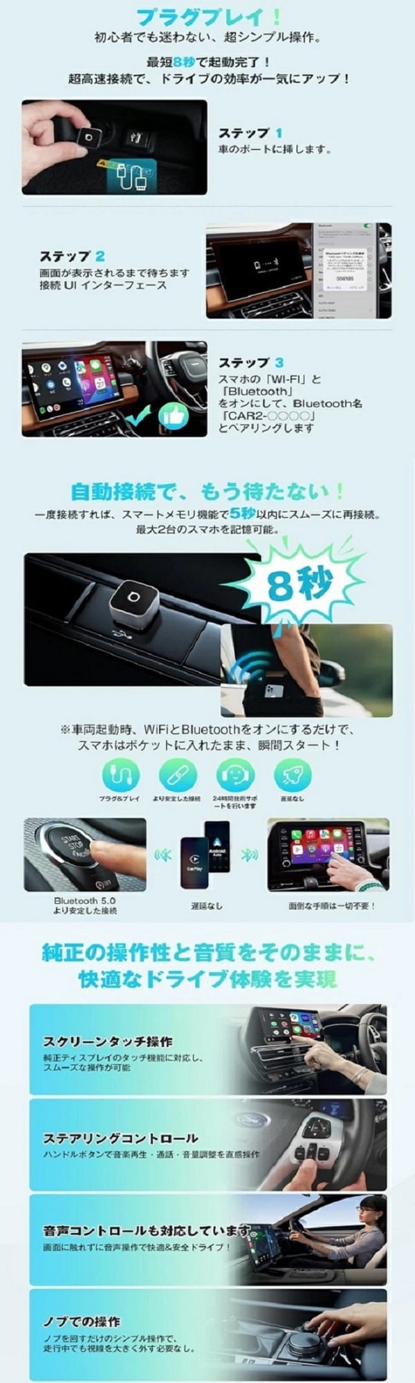 走行中でも安定した接続を維持し、途切れのない快適なドライブ体験をサポート。光沢のあるアルミボディで車内に自然になじみ、見た目もおしゃれ、手に馴染んで気持ちいいです。