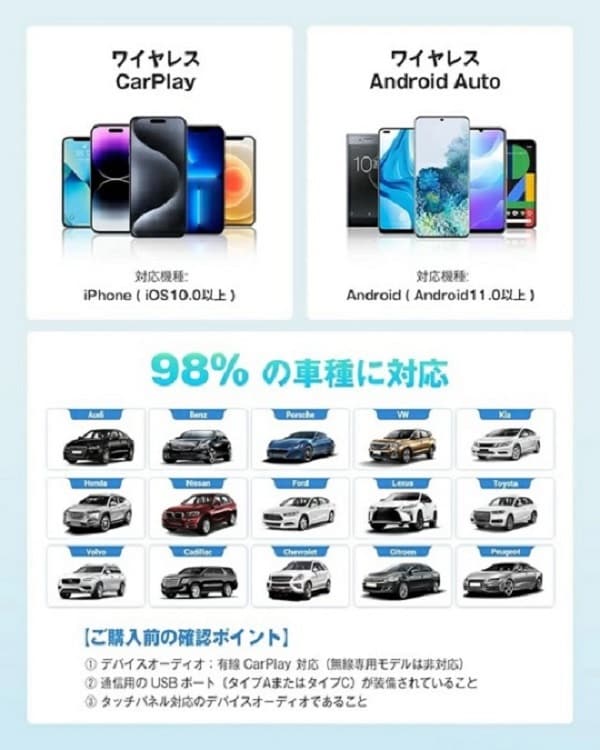 IOS 10以降 / Android OS 11 以降および一部の Samsung、Google 携帯電話用。ほとんど98%以上の車両に対応いたします、純正有線CarPlay/Android Auto搭載車適合。