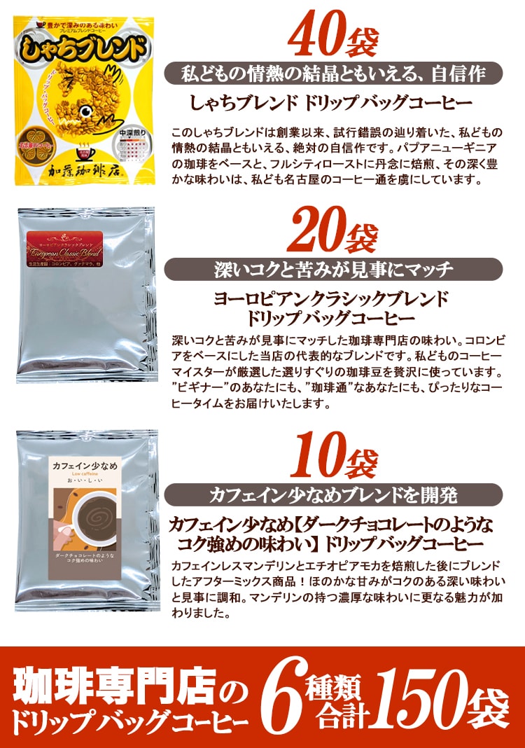 行列ができる珈琲専門店のドリップバッグコーヒー6つの味が楽しめるセットをご用意しました。大人気のしゃちブレンド、当店一番人気のゴールデンブレンド、Qグレードコーヒー100%使用のブレンド2種類、深いコクと苦みのヨーロピアンクラシックブレンド、カフェイン少なめのブレンド【ダークチョコレートのようなコク強めの味わい】 、合計150杯分入をお届けいたします。是非、お試しください。