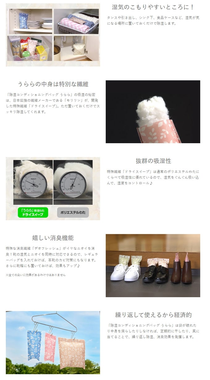 除湿コンディショニングバッグ うららは、日本屈指の繊維メーカーである「モリリン」が、開発した特殊繊維「ドライスイープ」が空気中の水分、湿気をぐんぐん吸い込み除湿を行います。置いておくだけでスッキリ除湿してくれて湿度をコントロール。特殊な消臭繊維「デオフレッシュ」がイヤなニオイを消臭!※さらに、ダニを寄せ付けない、防ダニ綿「アレルカット」を使用。置いておくだけで防ダニ効果も発揮!ダニを寄せ付けない、忌避効果もあります。うららは、袋が破れたり中身を濡らしたりしなければ、定期的に干したり、風に当てるだけで、繰り返し除湿、消臭効果を発揮します。
