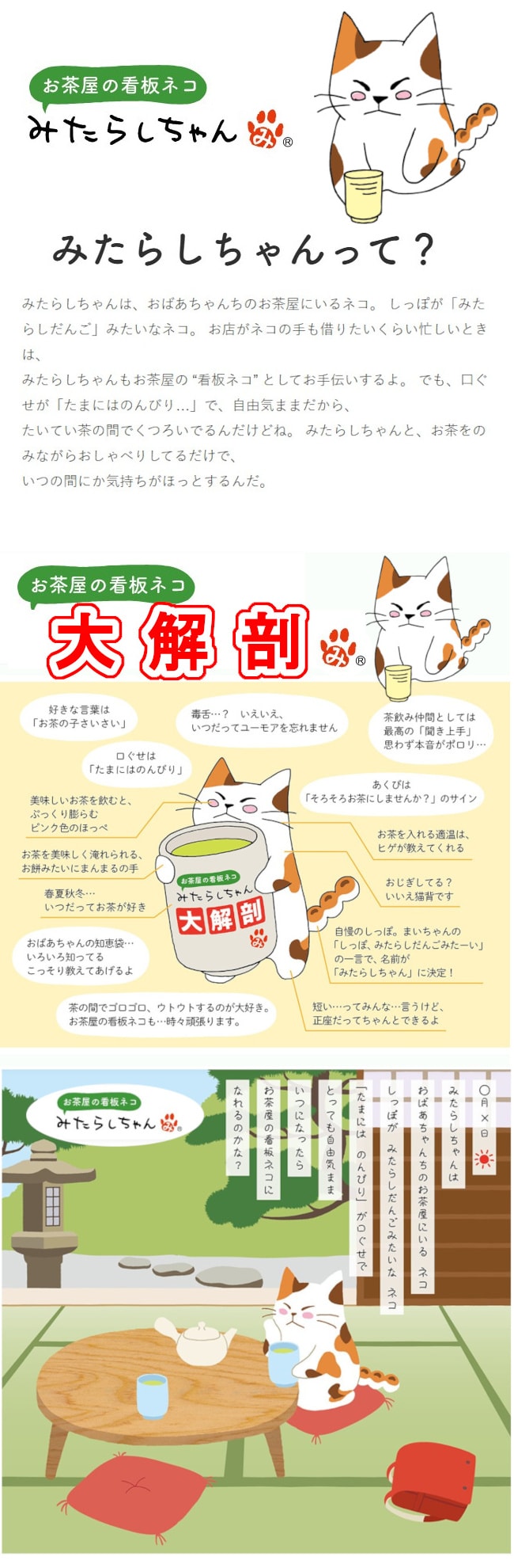 お店がネコの手も借りたいくらい忙しいときは、みたらしちゃんもお茶屋の “看板ネコ” としてお手伝いするよ。