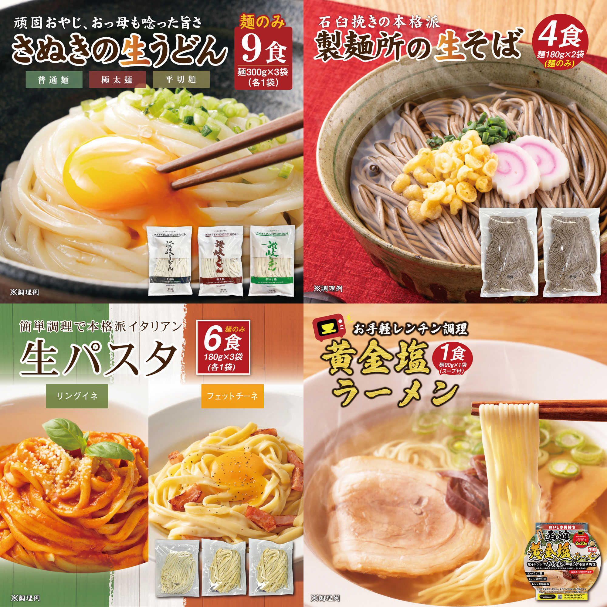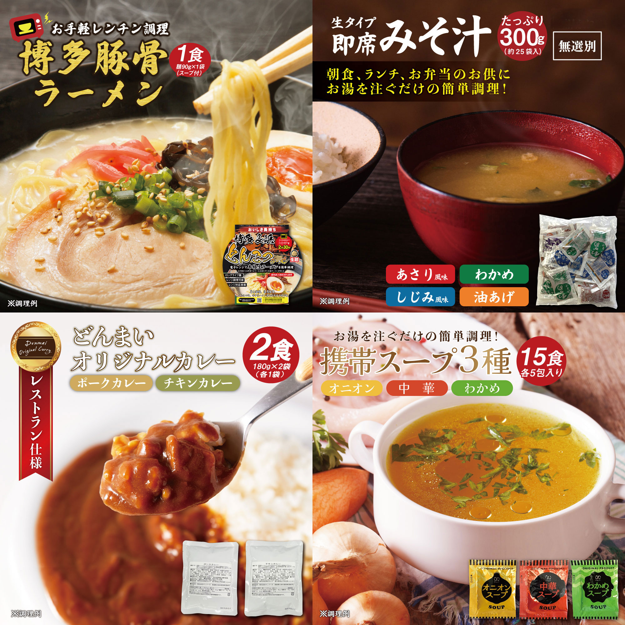 - 生うどん300g(3食分)×3袋(普通麺・極太麺・平切麺、各1袋)、生そば180g(2食分)×2袋、生パスタ180g(2食分)×3袋(リングイネ1袋、フェットチーネ2袋)、レンチン黄金塩ラーメン1食、レンチン博多豚骨ラーメン1食、味噌汁300g分(約25袋)、オリジナルレトルトカレー×2袋(ポーク、チキン、各1袋)、携帯スープ3種15包(オニオン、中華、わかめ各5包入り)