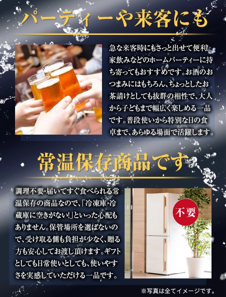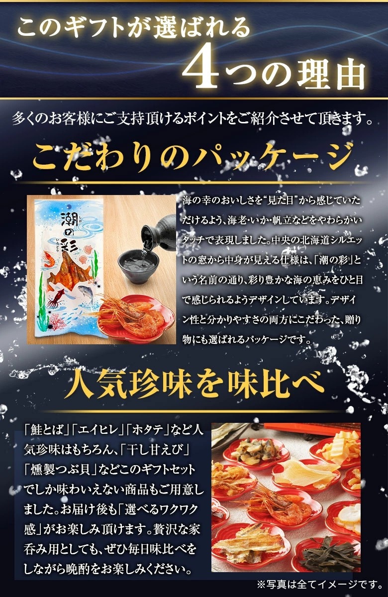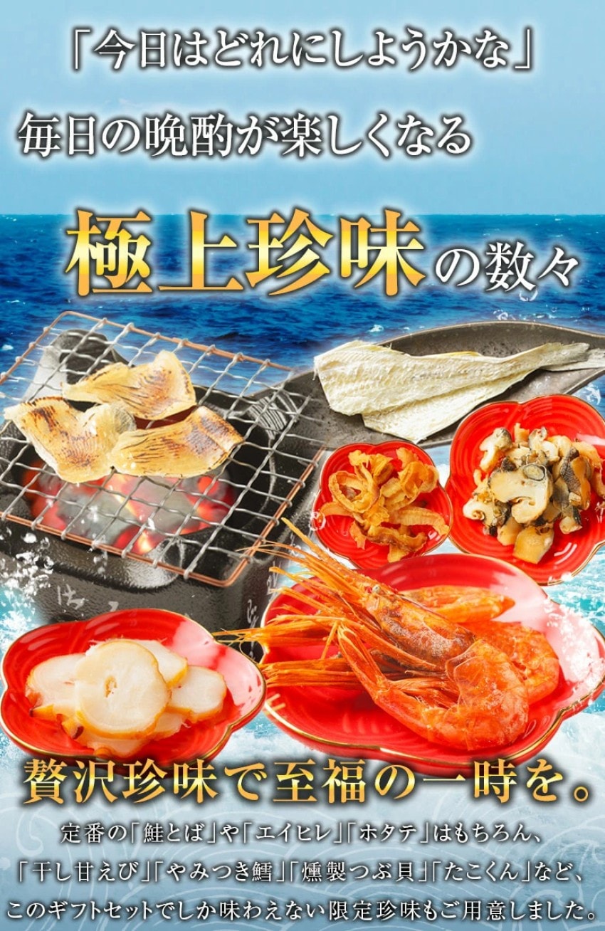 (干し甘えび・鮭とば・ほたて貝ひも・ほっけスティック・あなごの荒ほぐし・おつまみ昆布・たこくん・燻製さきいか・エイヒレ・やみつき鱈・燻製つぶ貝・開きコマイ)