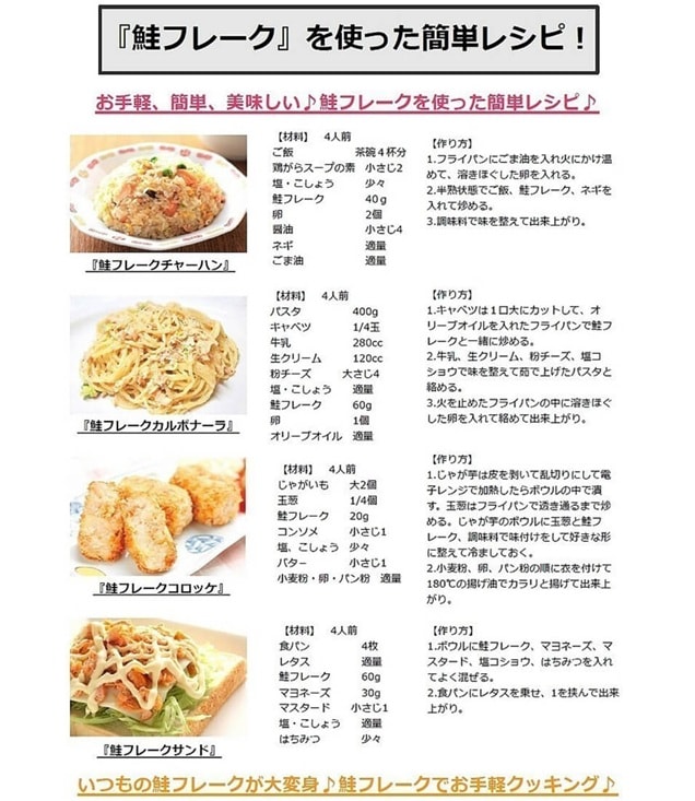 ・原材料/材質/素材:さけ(国産、ロシア他)、大豆たんぱく、植物油脂(大豆を含む)、食塩、かつお節エキス、調味料(アミノ酸等)、着色料(黄5、赤102)