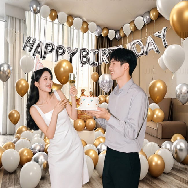 - HAPPY BIRTHDAY1セット・星バルーン・王冠バルーン各1個・その他風船38個・ストロー1本・両面テープ・紐