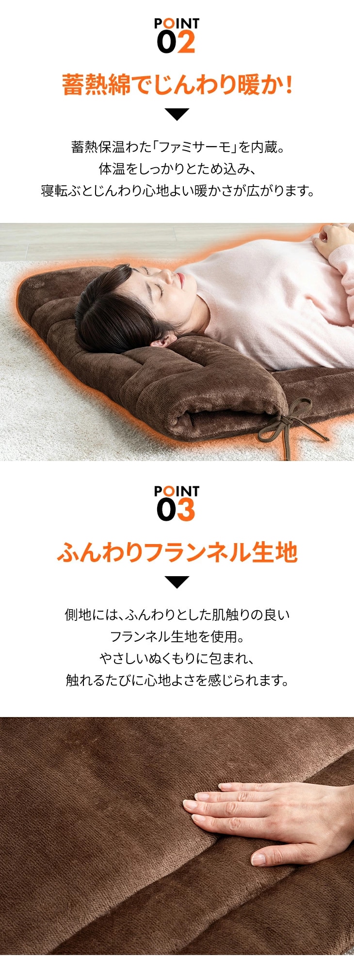 体から出る熱を吸収し蓄熱する素材「ファミサーモ」を柔らかな毛布地で挟んだ3層構造で暖かさをキープ。やわらかくとろけるような肌触り。折りたたんでヒモで結べば枕に早変わり!疲れた足の足枕としても大活躍します。