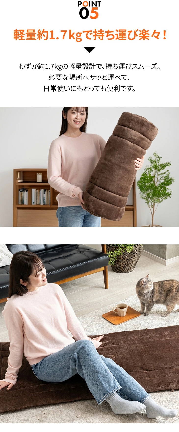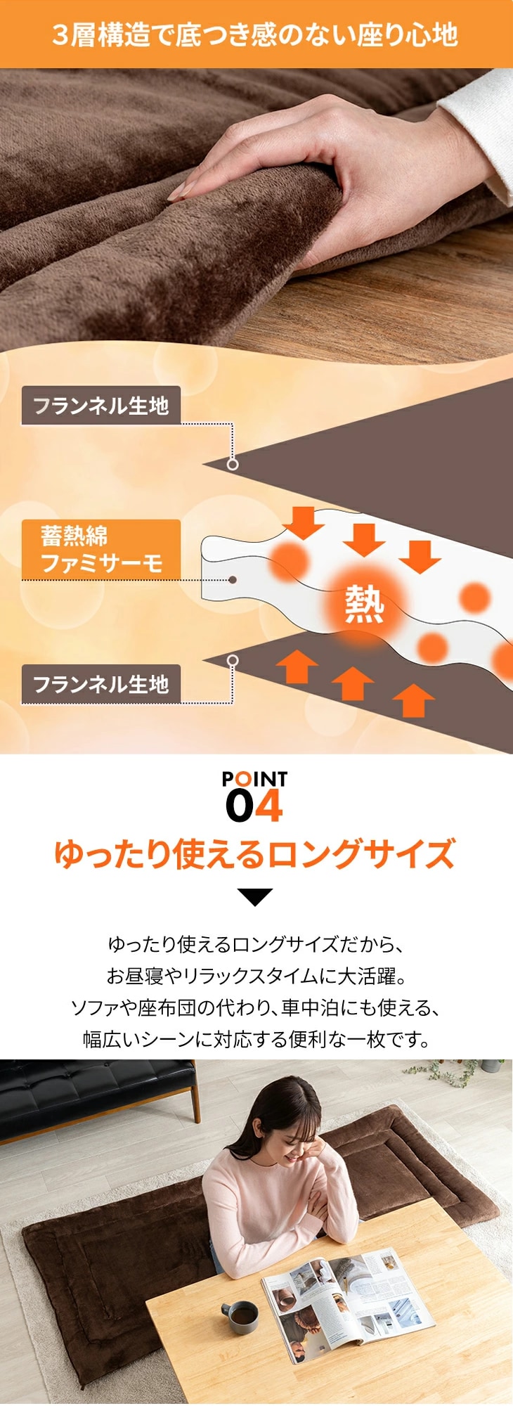 お昼寝・一時的な布団代わりに…リビングや和室でのお昼寝、リラックスしたい時のごろ寝布団として最適。冷えやすい床の上での底冷え対策にもおすすめです。