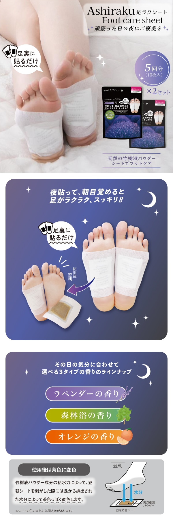 ※竹樹液パウダー成分の吸水力によって、翌朝シートを剥がした際には足から排出された水分によって茶色っぽく変色します。(シートの色の変化には個人差があります。)
