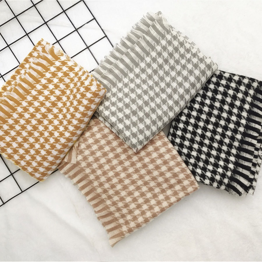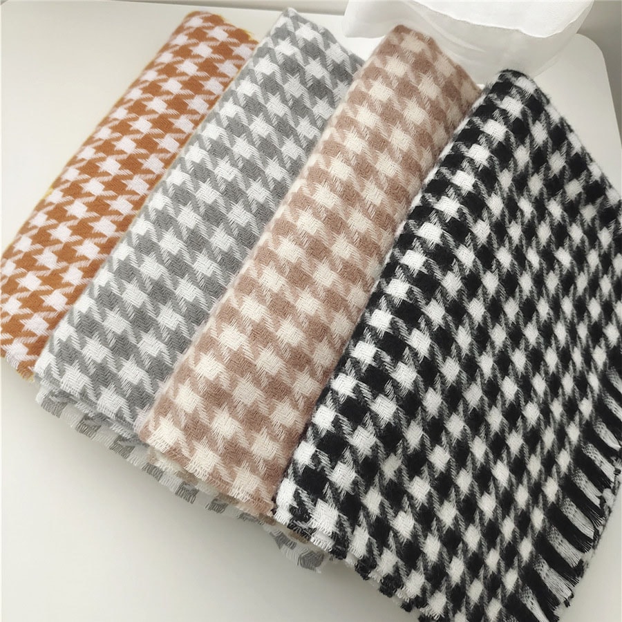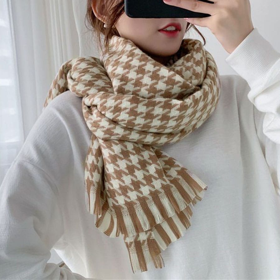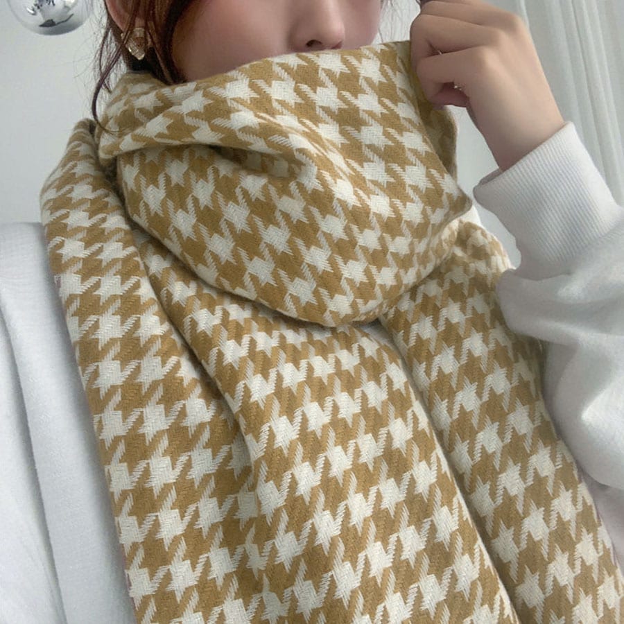 【キャメルホワイト】千鳥格子柄ストール | 太めのフリンジと、首元に巻いたときのボリュームが可愛く小顔効果も