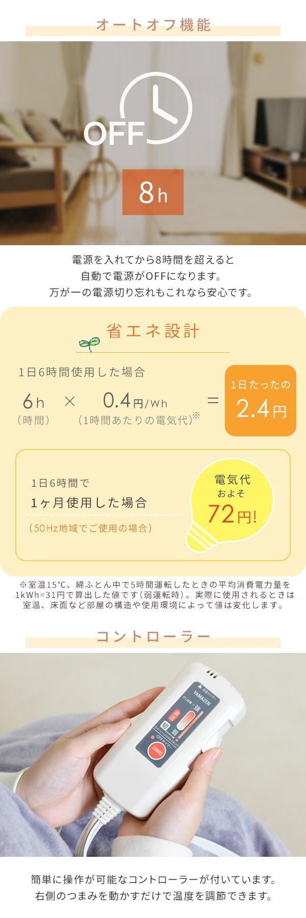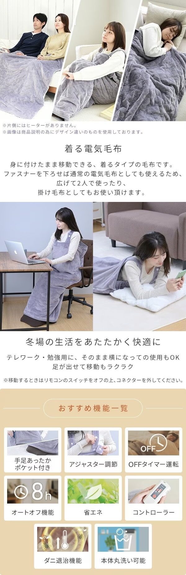 ・その他商品仕様:消費電力:40W、表面温度:(弱)約23度、(適温)約33度、(強)約53度、電気代目安(1時間あたり):(弱)約0.4円、(適温)約0.6円、(強)約0.8円 ※電気料金目安単価31円/kWhを基に算出、電源コード長さ:(電源側)1.96m、(本体側)0.65m、2時間オフタイマー・8時間自動オフ、肩ヒモ調節可能(身長目安150-180cm)、ダニ退治機能