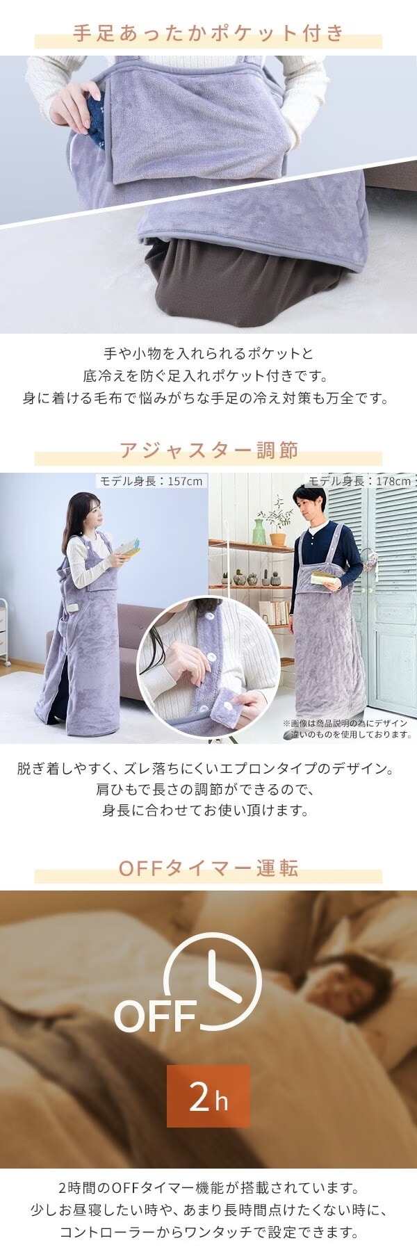 1.全身ポカポカ!最高の温もり: 体の熱を逃がさず、電気の力でじんわり温めます。冷えやすい足元だけでなく、肩からお尻までしっかり覆うため、全身がポカポカに。着用時ウエストは最大130cmまで対応可能です。