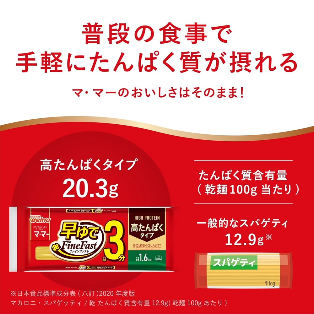 日清ウェルナの「マ・マ― 高たんぱく スパゲティ 早ゆで3分 1.6mm」は、栄養とおいしさを両立した新しいスパゲティです。