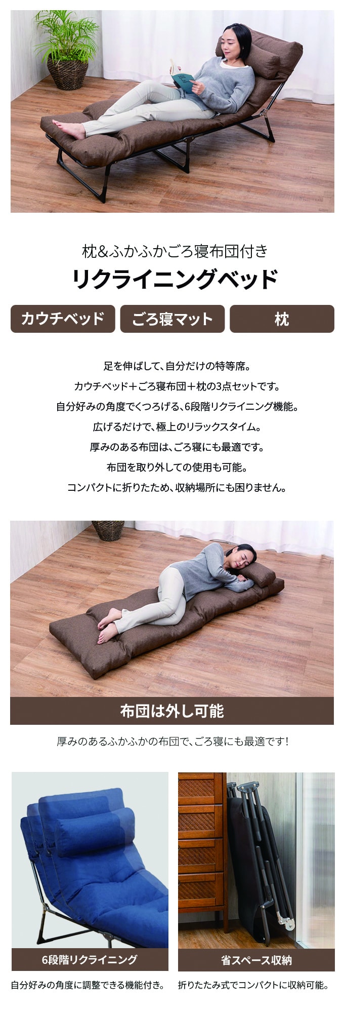 カウチベッド+ごろ寝マット+枕の3点セットです。自分好みの角度でくつろげる、6段階リクライニング機能。広げるだけで、極上のリラックスタイム。厚みのある布団は、ごろ寝にも最適です。布団を取り外しての使用も可能。コンパクトに折りたため、収納場所にも困りません。