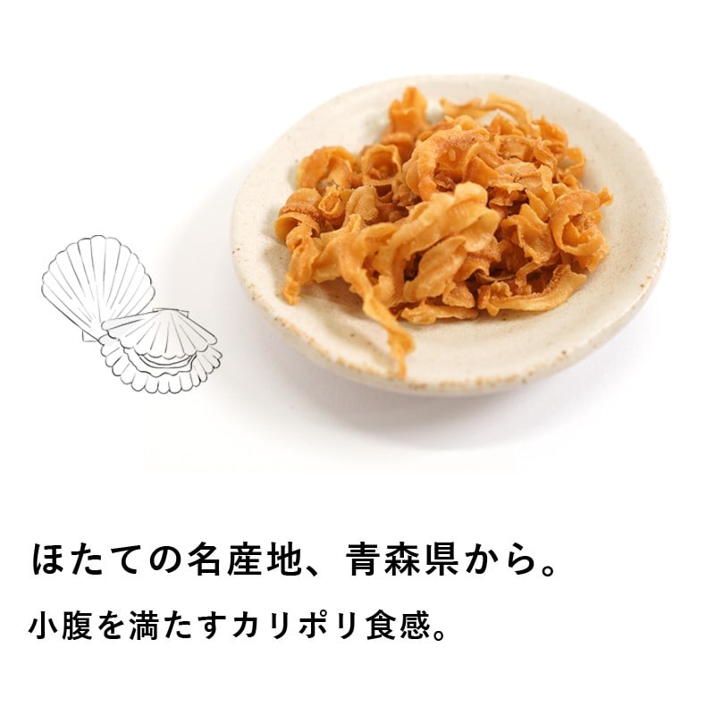 原材料名:ホタテヒモ(青森県産)、ほたてエキスシーズニング、竜田揚げの素、菜種油、塩(津軽海峡産)、調味料(アミノ酸等)、香料(原材料の一部に大豆、豚肉を含む)