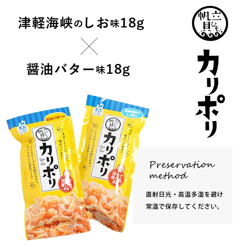 カリポリ貝ひも(塩味・醤油バター)各1袋 おつまみ・珍味 | 青森県産のホタテ貝ひもを塩味・醤油バター味でカリカリに仕上げました