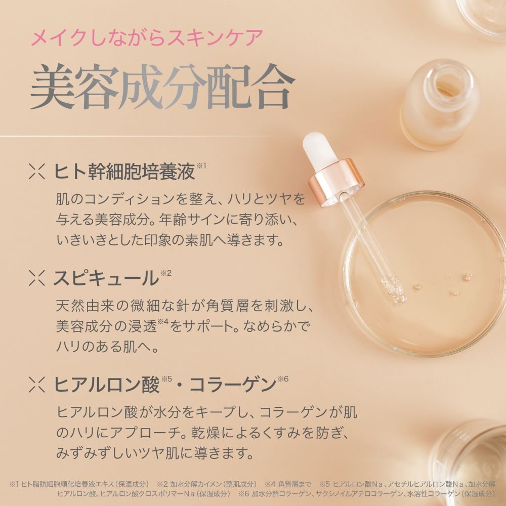 ・原材料/材質/素材:水、シクロペンタシロキサン、パルミチン酸エチルヘキシル、メトキシケイヒ酸エチルヘキシル、セチルPEG/PPG-10/1ジメチコン、DPG、BG、ジメチコン、ソルビトール、ジステアルジモニウムヘクトライト、エタノール、ヒト脂肪細胞順化培養液エキス、加水分解カイメン、セラミドNP、アセチルヒアルロン酸Na、加水分解ヒアルロン酸、ヒアルロン酸クロスポリマーNa、加水分解コラーゲン、サクシノイルアテロコラーゲン、水溶性コラーゲン、アスコルビルグルコシド、テトラヘキシルデカン酸アスコルビル、パルミチン酸アスコルビルリン酸3Na、リン酸アスコルビルMg、酵母エキス、イチゴ果実エキス、ウメ種子エキス、サトザクラ花種子エキス、ラベンダー花エキス、オリーブ果実油、ペンチレングリコール、1,2-ヘキサンジオール、カプリリルグリコール、ジイソステアリン酸ポリグリセリル-2、(クエン酸/乳酸/リノール酸/オレイン酸)グリセリル、トロポロン、トリエトキシカプリリルシラン、ハイドロゲンジメチコン、硫酸Mg、水酸化AI、ケイ酸Ca、ケイ酸Na、ポリソルベート60、酢酸コトフェロール、フェノキシエタノール、メチルパラベン、タルク、酸化鉄