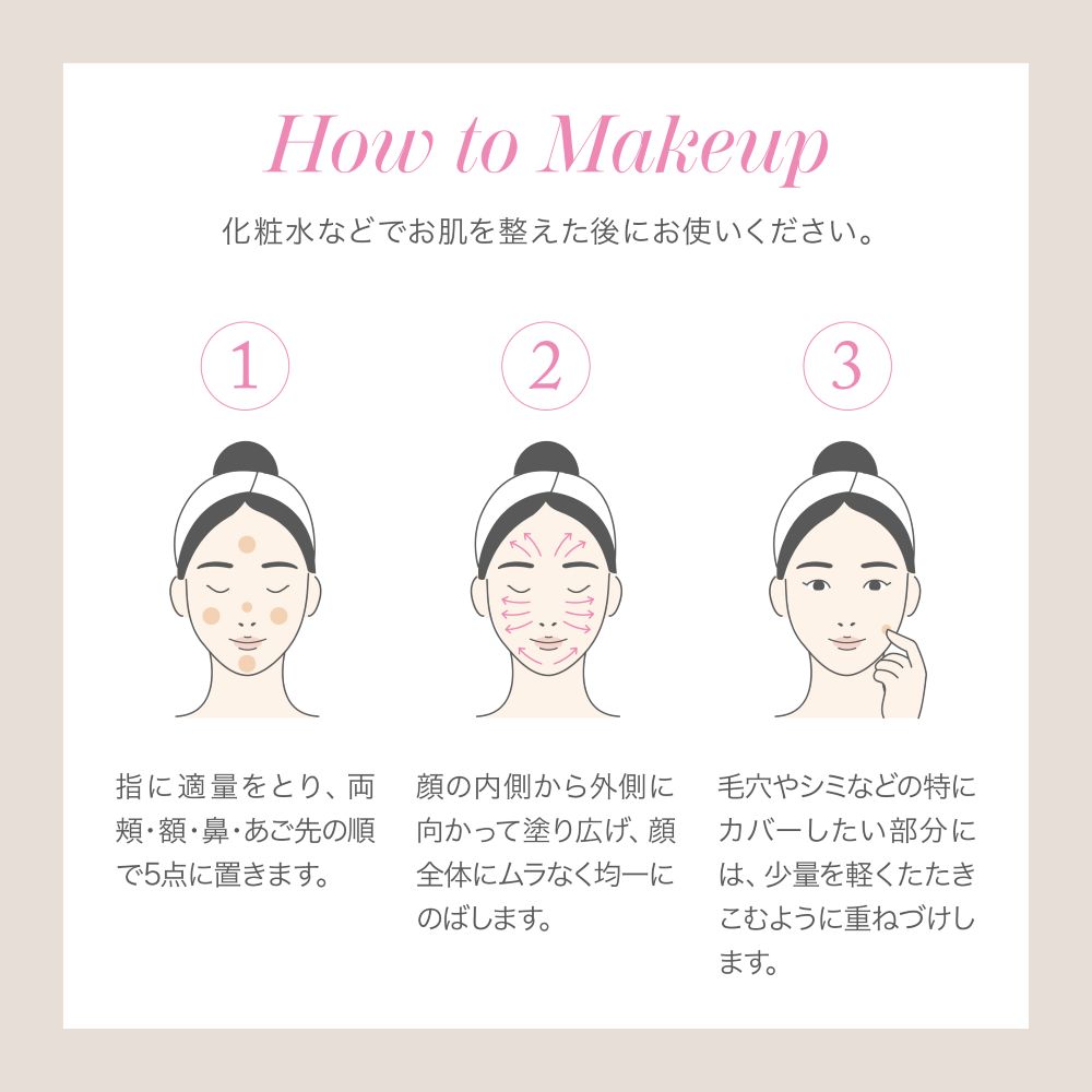 化粧水などでお肌を整えた後にお使い下さい。・指に適量をとり、両頬、額、鼻、あご先の順で5点置きます。